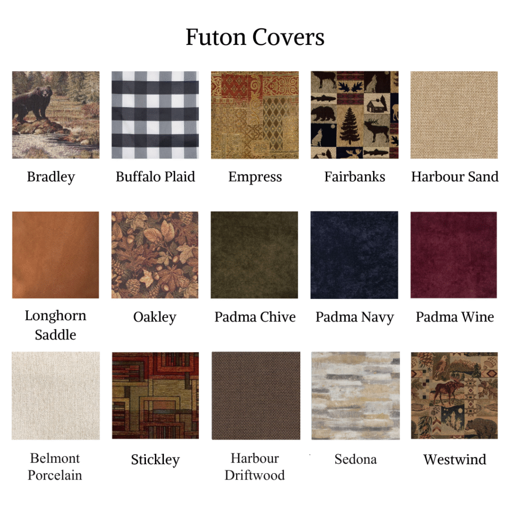 | Futon Cover | Bradley, Buffalo Plaid, Empress, Fairbanks, Harbour Sand, Longhorn Saddle, Oakley, Padma Chive, Padma Navy, Padma Wine, Harbour Driftwood, Stickley, Belmont Porcelain, Sedona, Westwind |